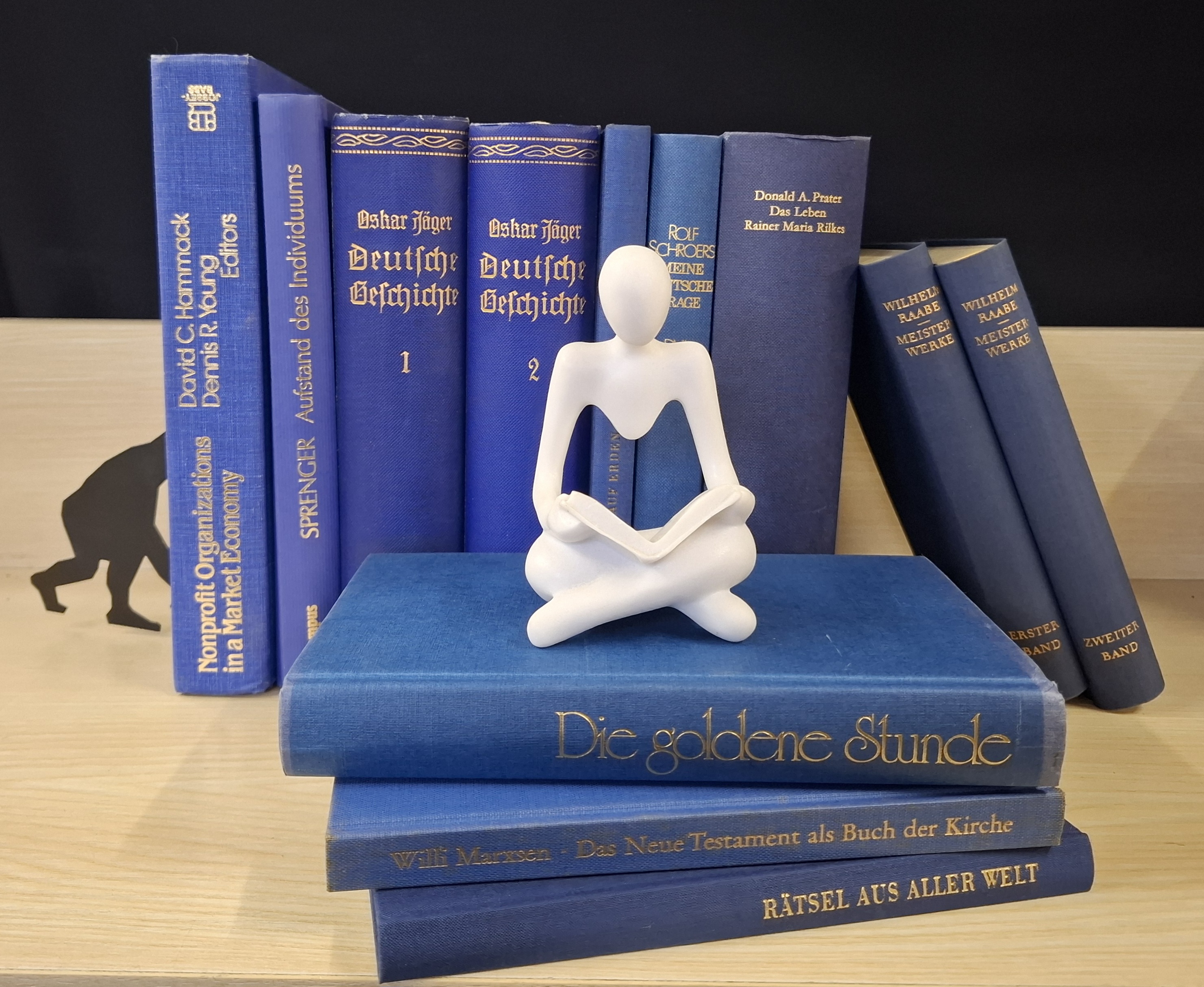 Sie erhalten das abgebildete Bücherpaket in blau-goldenen Farbtönen. Der Zustand der Bücher ist dem Alter entsprechend ordentlich.