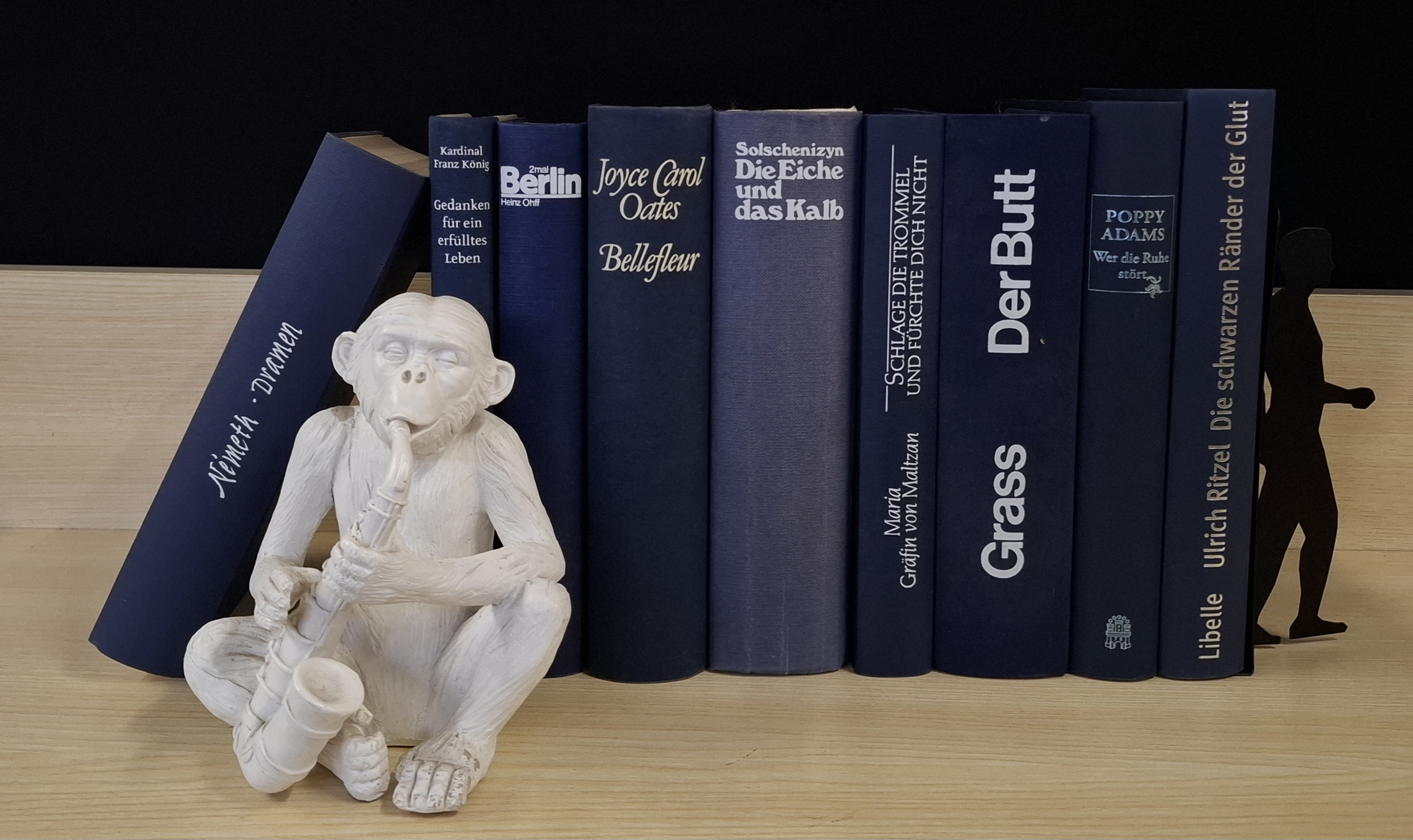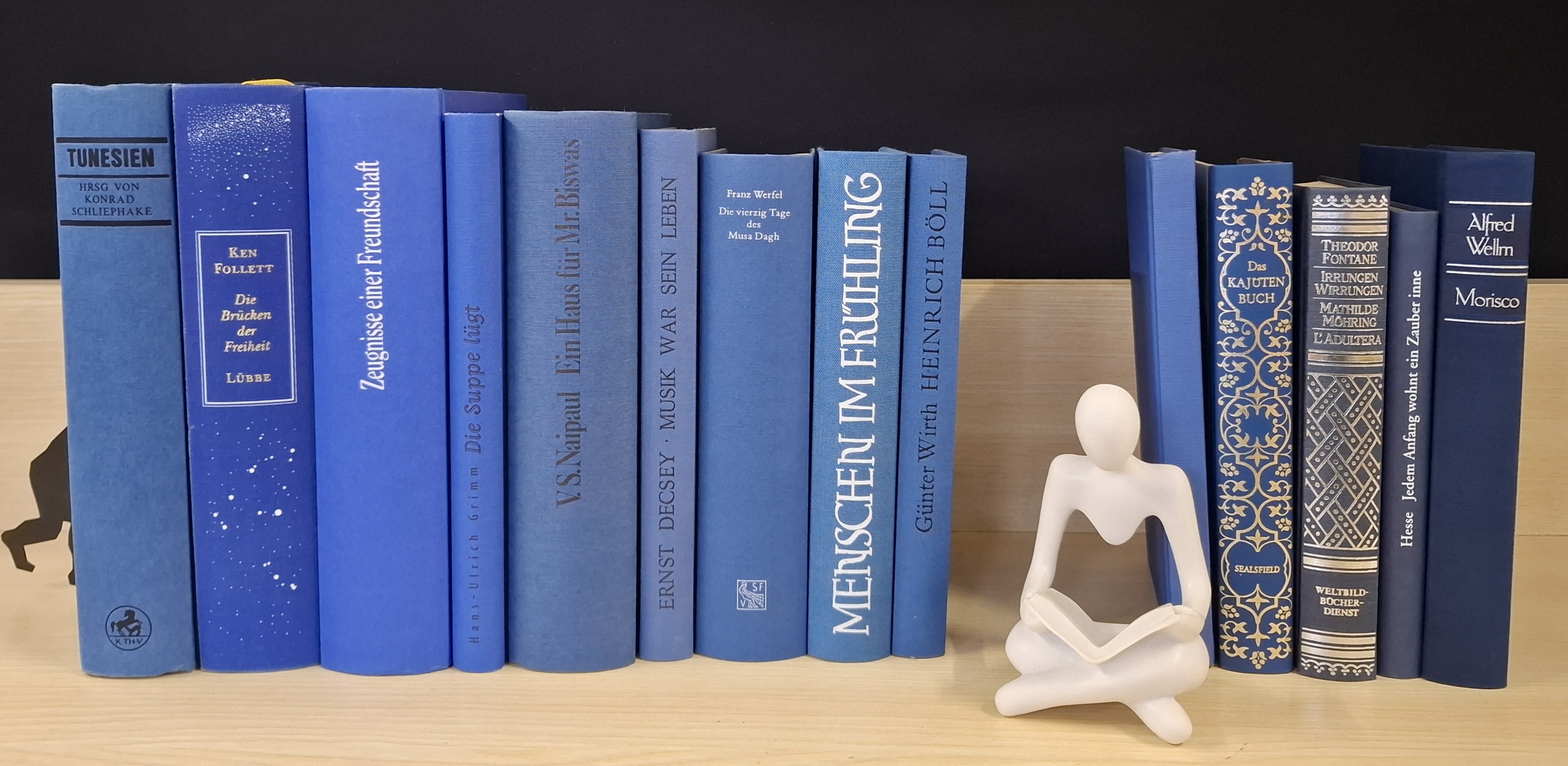 Sie erhalten das abgebildete Bücherpaket in blauen Farbtönen. Der Zustand der Bücher ist dem Alter entsprechend ordentlich.