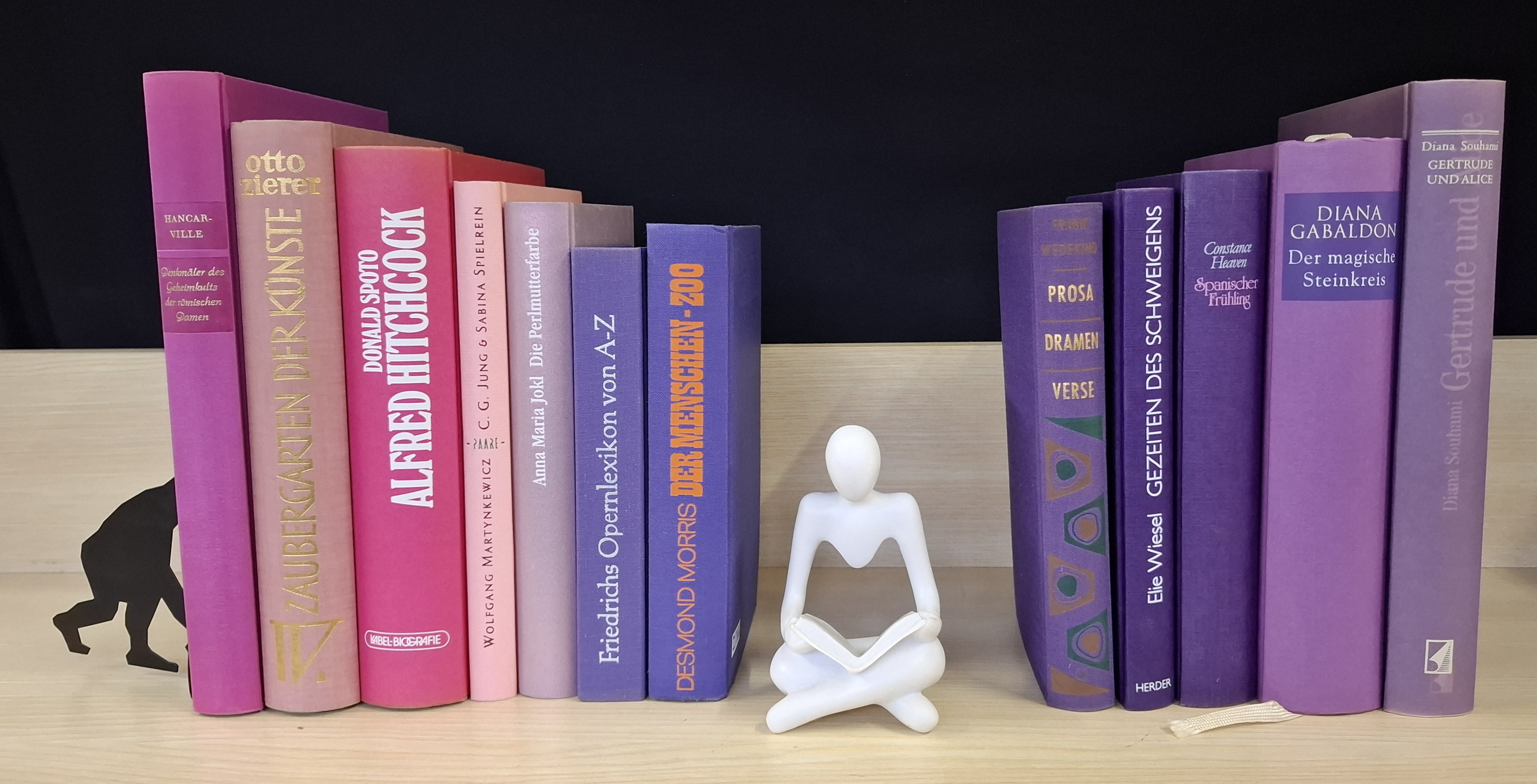 Sie erhalten das abgebildete Bücherpaket in rosa-lila Farbtönen. Der Zustand der Bücher ist dem Alter entsprechend ordentlich.