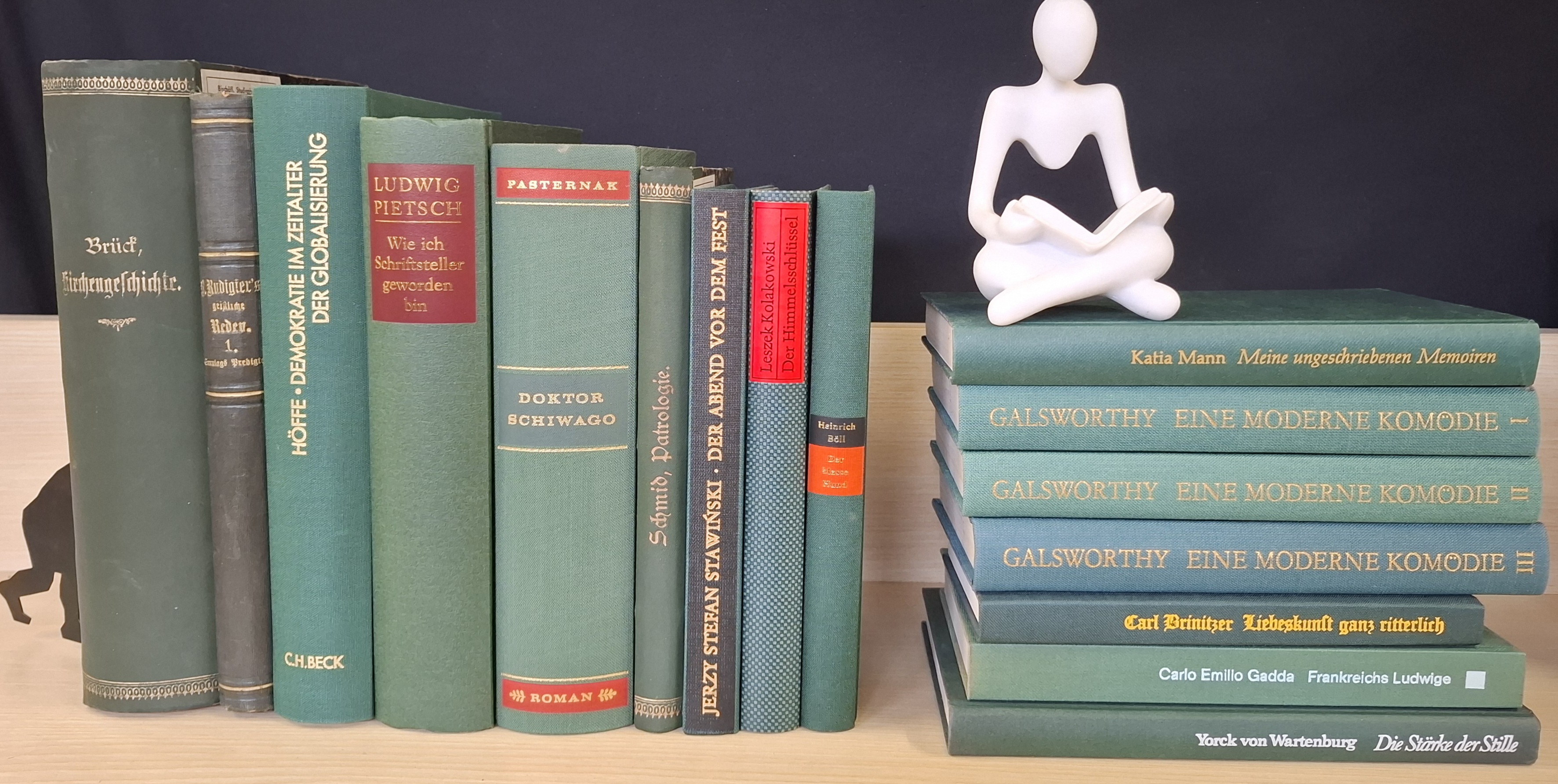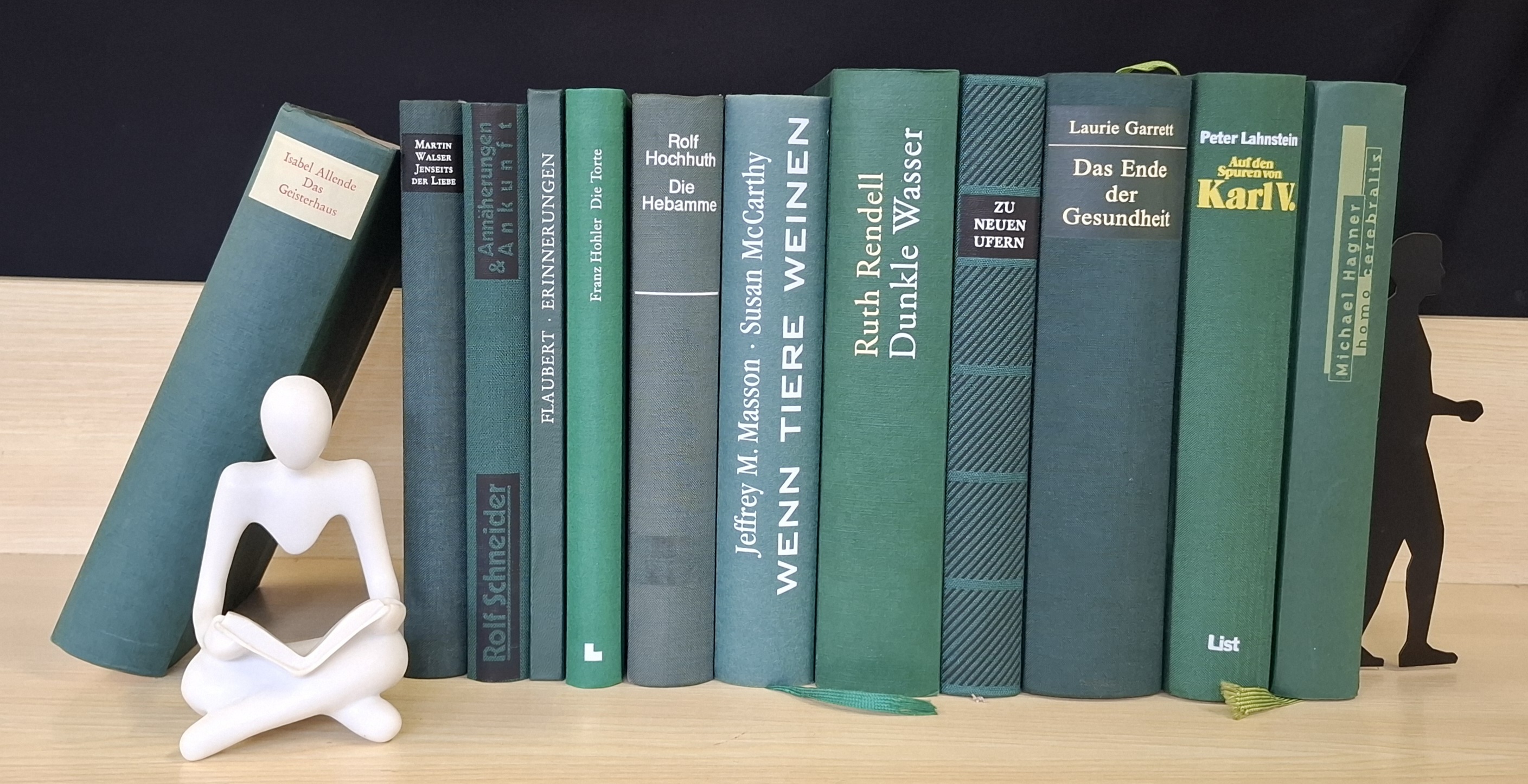 Sie erhalten das abgebildete Bücherpaket in grünen Farbtönen. Der Zustand der Bücher ist dem Alter entsprechend ordentlich.