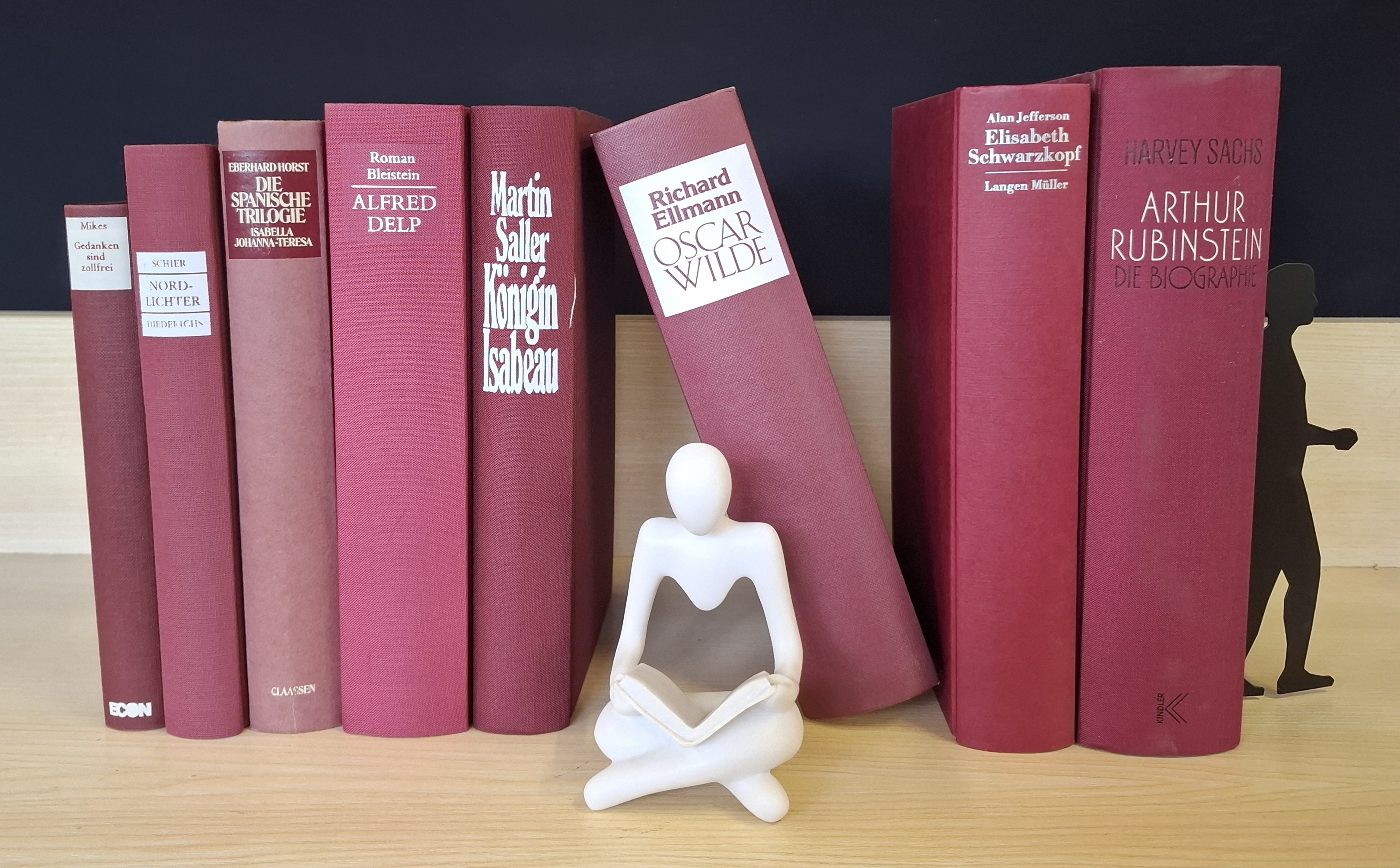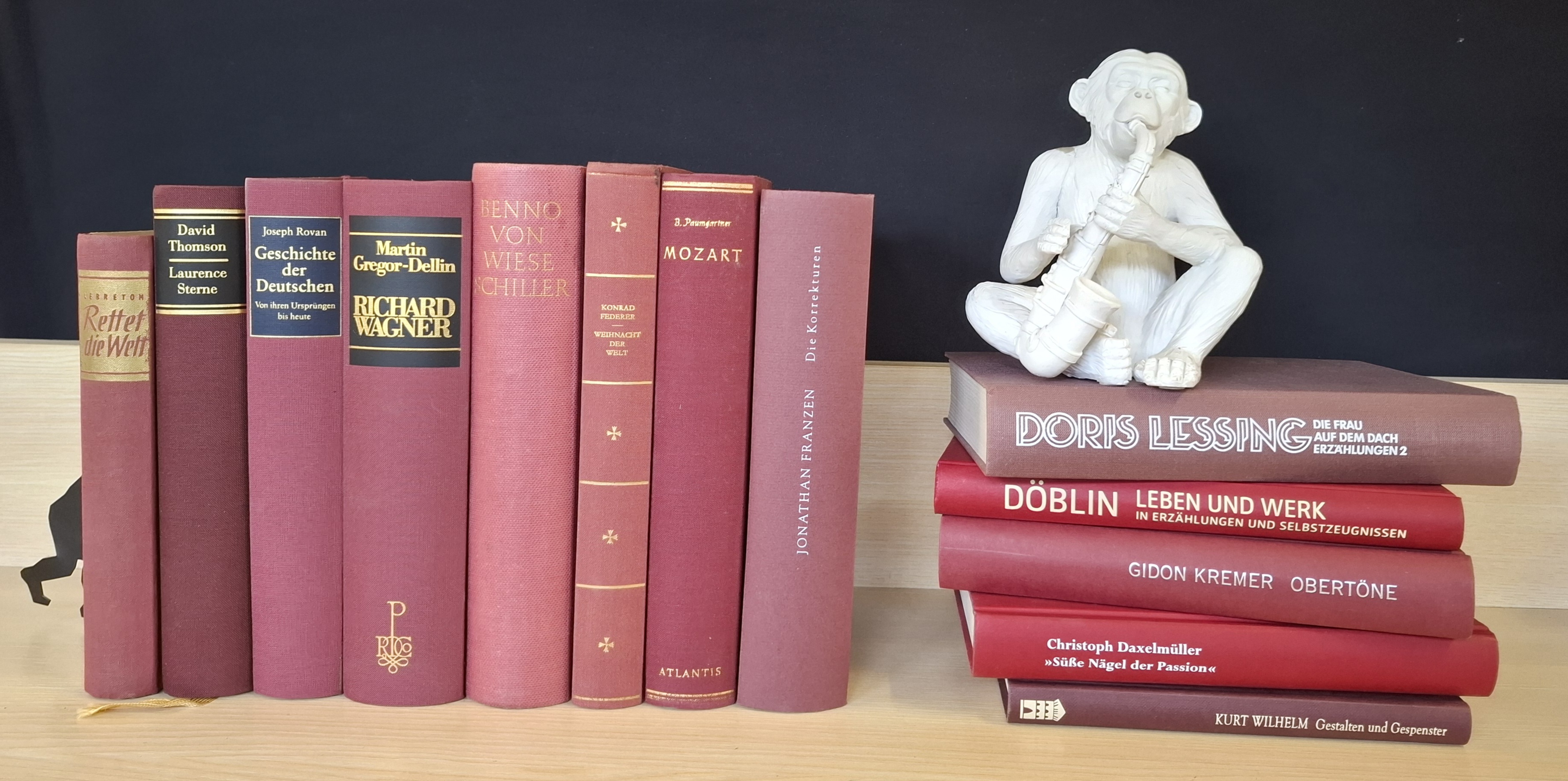 Sie erhalten das abgebildete Bücherpaket in bordeauxroten Farbtönen. Der Zustand der Bücher ist dem Alter entsprechend ordentlich.